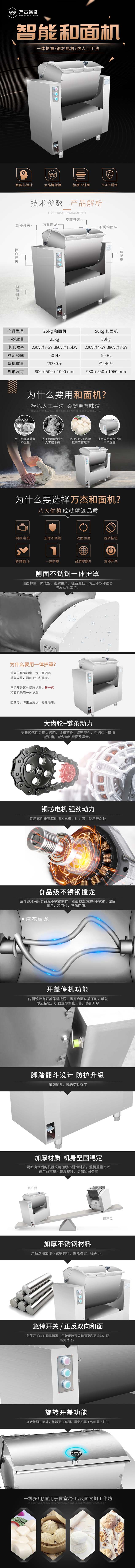 ■ 主要技術參數(shù): 一次和面量:25KG 產品型號:WJ-HMJ50A 一次和面量:50KG 額定電壓:380V 功 率:3.0KW 外形尺寸:980×550×1060MM 機器重量:220KG ■ 性能特點: 1. 采用腳踏翻斗,降低勞動強度 2. 具有掀蓋停機功能,集成線路板起過載、短路、缺相、過壓、欠壓保護作用,穩(wěn)定系數(shù)高 3. 采用銅線電機,配備好的減速機,穩(wěn)定耐用噪音低 4. 面斗部分采用好的不銹鋼制作,和面攪龍為304不銹鋼,堅固耐用,美觀大方 ■ 產品介紹: